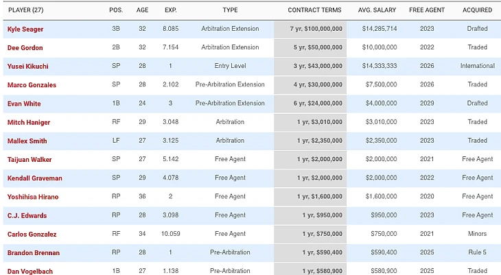 Но все же команде очень сложно перестраиваться, Маринерс тратят на зарплатную ведомость почти 100$ млн. Это с учетом сумасшедших 28$ млн игрокам, которые уже не выступают за команду. Но ещё до 2022 года команда будет продолжать тянуть тяжелые контракты платя Гордо и Сигеру в общей сложности 30 на двоих.