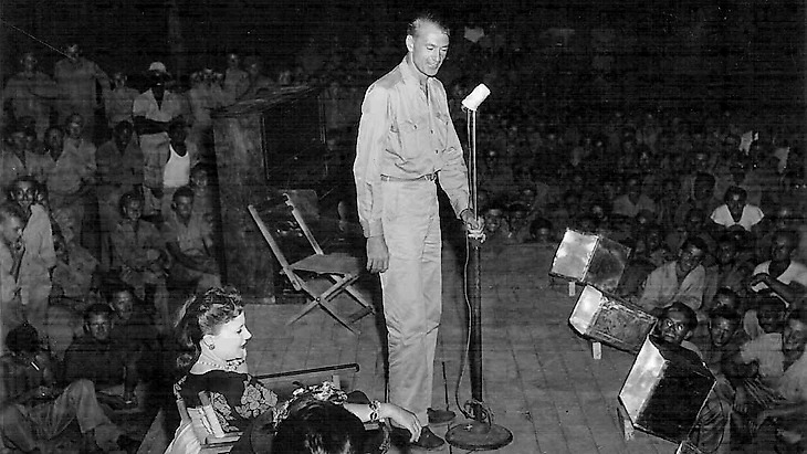 Гэри Купер выступает перед солдатами армии США.