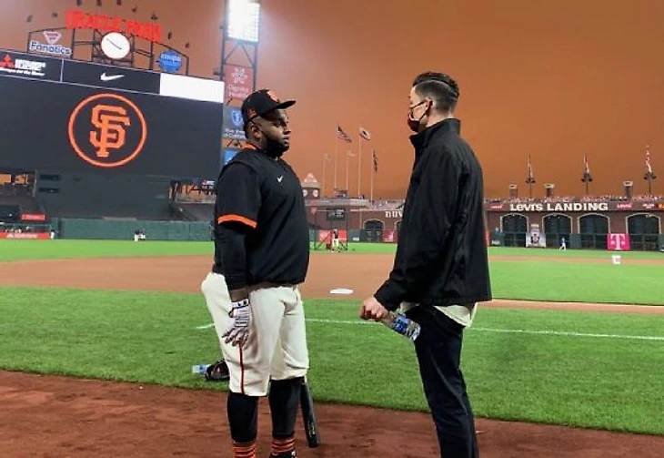 Он приехал на «Оракл Парк» 9 сентября, в день, когда лесные пожары окрасили небо калифорнии в оранжевый цвет. Он нервничал. На лице была маска с логотипом «Джайентс». Он не стал вставлять свой протез. Игроки, тренеры и другой персонал собрались снаружи. Александер представила его. Он сжал в руке микрофон.