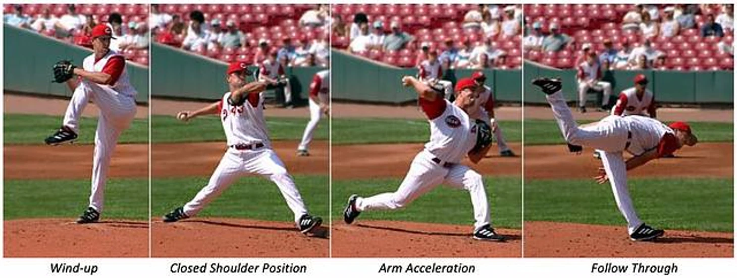 Движение руки при броске бейсбольного мяча включает в себя серию движений, которые начинаются с исходного положения руки и заканчиваются завершением броска (высвобождением энергии после броска). Исходное положение - это положение руки, с которого начинается движение, когда бросающий переставляет ногу и начинает отводить руку. Оттуда он перейдет к фазе доставки мяча по направлению к цели, где он будет выносить руку вперед круговым движением, с локтем на уровне плеча или чуть выше. Когда рука движется вперед, запястье опускается вниз и высвобождает мяч.