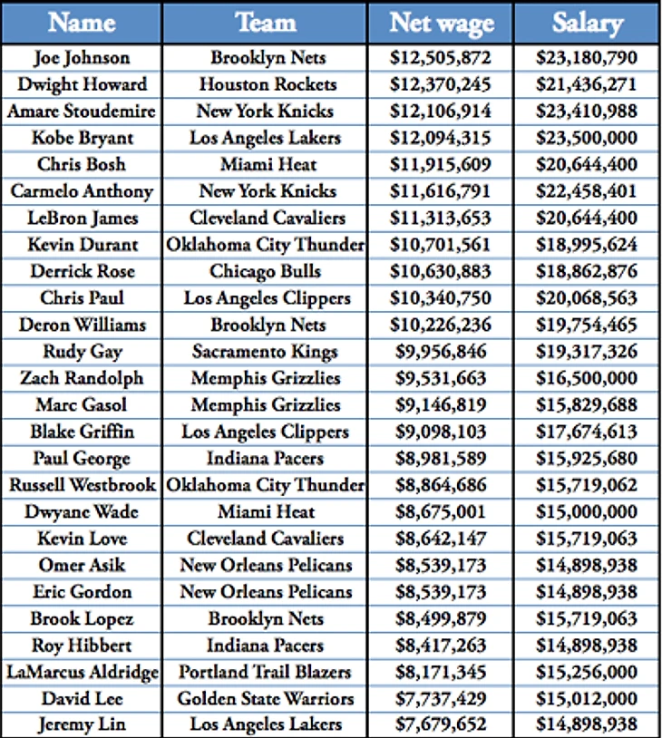 Самым высокооплачиваемым игроком лиги с учетом налогов является защитник «Нетс» Джо Джонсон, который заработает 12,5 миллиона долларов. Обладатель самого крупного годового контракта Кобе Брайант из «Лейкерс» получит чистыми 12,094 миллиона, что является четвертым показателем в НБА.