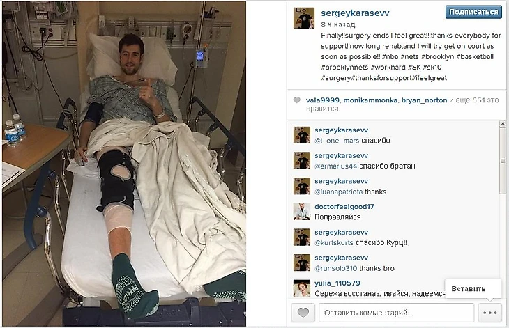 «Наконец-то, операция закончилась. Чувствую себя отлично. Всем спасибо за поддержку. Постараюсь вернуться как можно скорее», – написал Карасев в своем инстаграме.