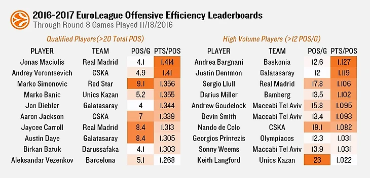Защитники ЦСКА и УНИКСа Нандо Де Коло и Кит Лэнгфорд вошли в десятку самых эффективных игроков после 8 туров. По данным Synergy Sports, француз набирает 1,082 очка за владение и располагается на седьмом месте среди звезд, имеющих больше 12 владений за матч. Американец с 1,022 очка – на десятом месте.