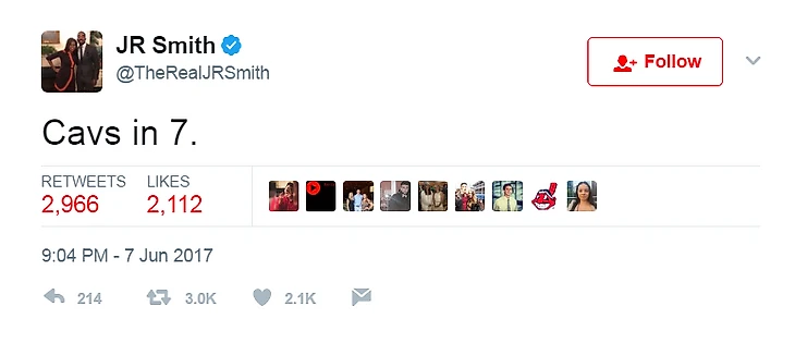 Атакующий защитник Джей Ар Смит не готов сдаться, несмотря на третье поражение своей команды в финальной серии плей-офф против «Голден Стэйт» (113:118, 0-3). Сразу после игры Смит написал в твиттере свой прогноз на исход серии: «Кливленд в 7 матчах».