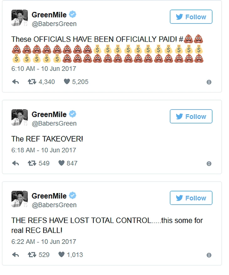 «Этим судьям заплатили! АРБИТРЫ ПОТЕРЯЛИ КОНТРОЛЬ НАД ИГРОЙ!», – написала Бэйберс-Грин в твиттере.