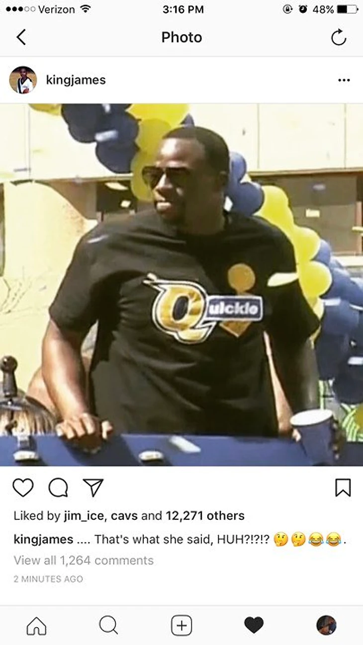 Лидер «Кавальерс» ЛеБрон Джеймс отреагировал на троллинг форварда «Голден Стэйт» Дрэймонда Грина, который предстал на чемпионском параде в футболке с надписью «Quickie».