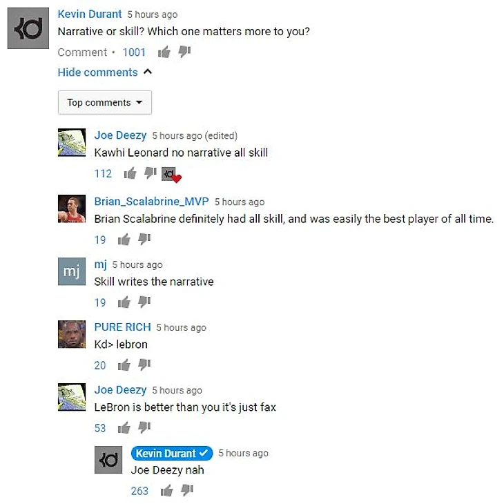 Форвард «Голден Стэйт» Кевин Дюрэнт вмешался в разговор на своем канале YouTube, когда один из болельщиков заявил, что ЛеБрон Джеймс («Кливленд») лучше Дюрэнта.