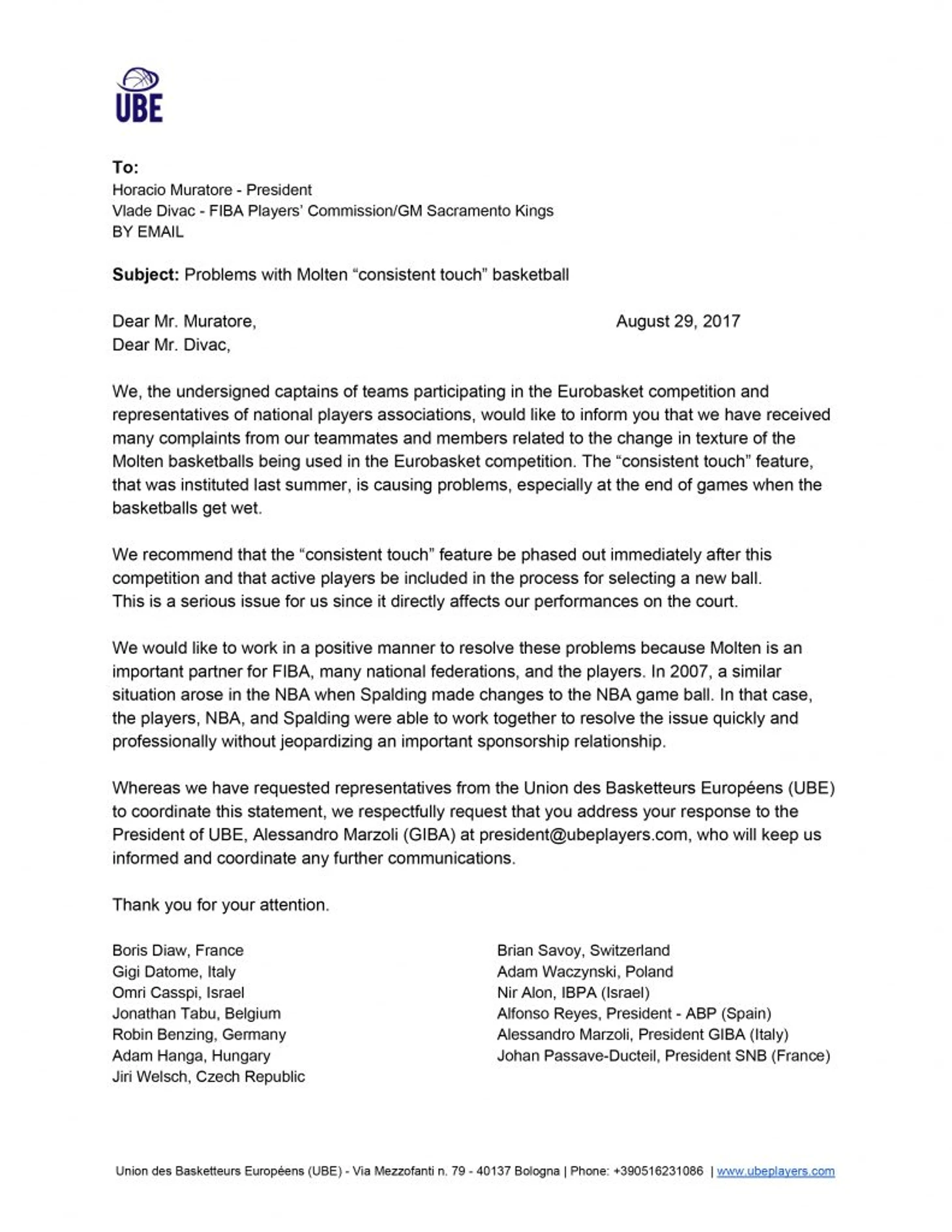 Капитаны восьми сборных, которые примут участие в Евробаскете-2017, направили президенту ФИБА Орасио Мураторе письмо, в котором выразили недовольство в связи с выбором организации при замене официального игрового мяча предстоящего первенства.