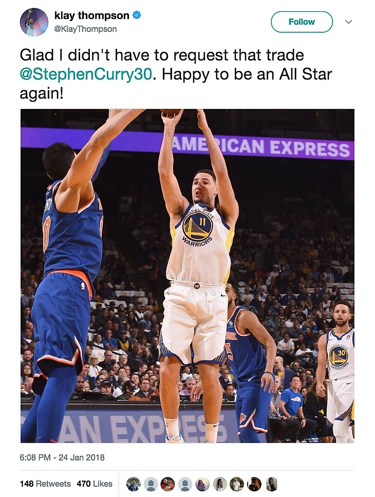 «Рад, что мне не пришлось требовать обмена. Счастлив снова участвовать в Матче всех звезд», – написал Томпсон в твиттере, но вскоре удалил сообщение.