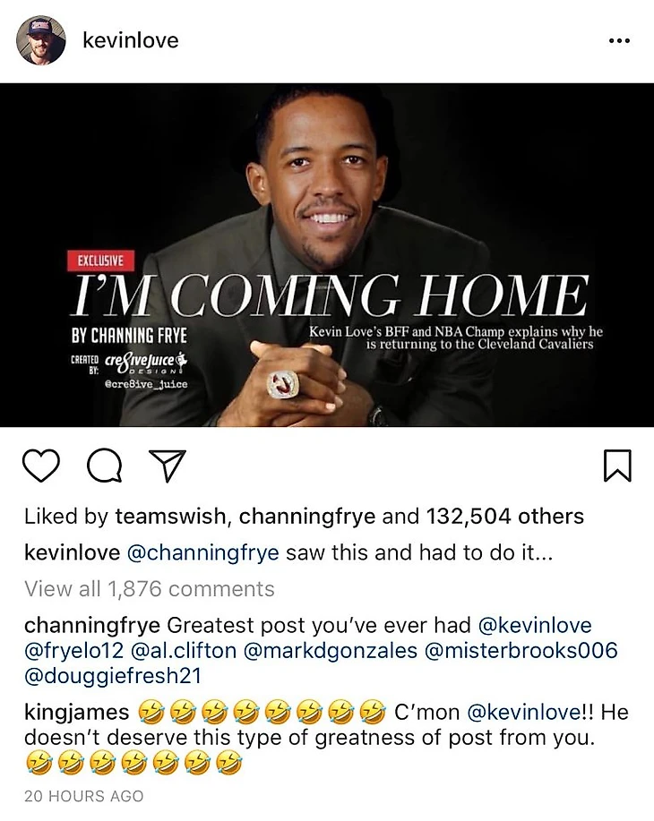 Форвард «Кливленда» Кевин Лав опубликовал картинку в своем инстаграме в честь возвращения Ченнинга Фрая в клуб. На ней изображение игрока помещено на знаменитый кадр, сообщающий о возвращении Леброна Джеймса в «Кэвз» в 2014-м.