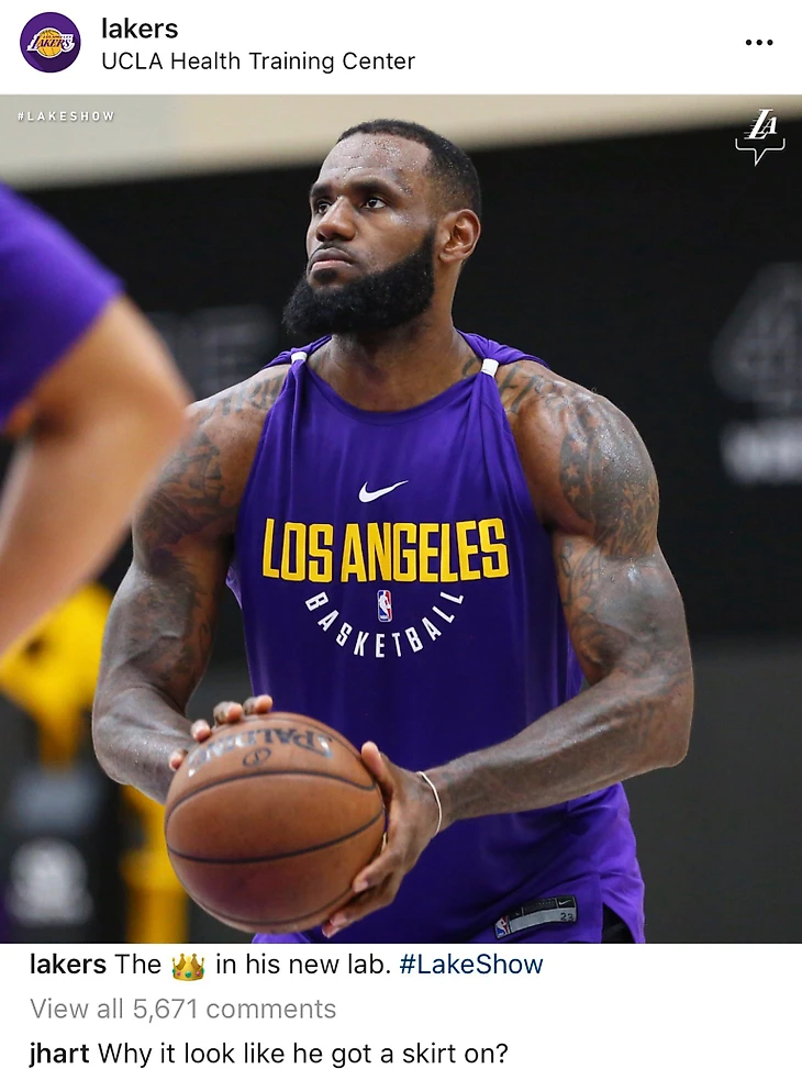 Новобранец «Лейкерс» Леброн Джеймс стал объектом шуток одноклубников в соцсетях. Форвард Джош Харт написал под фотографией с первой тренировки: «Почему выглядит так, как будто на нем юбка?»