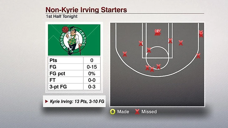 Разыгрывающий Кайри Ирвинг стал единственным игроком стартовой пятерки «Селтикс», который набрал очки в 1-й половине матча с «Санз», сообщает ESPN Stats & Info.