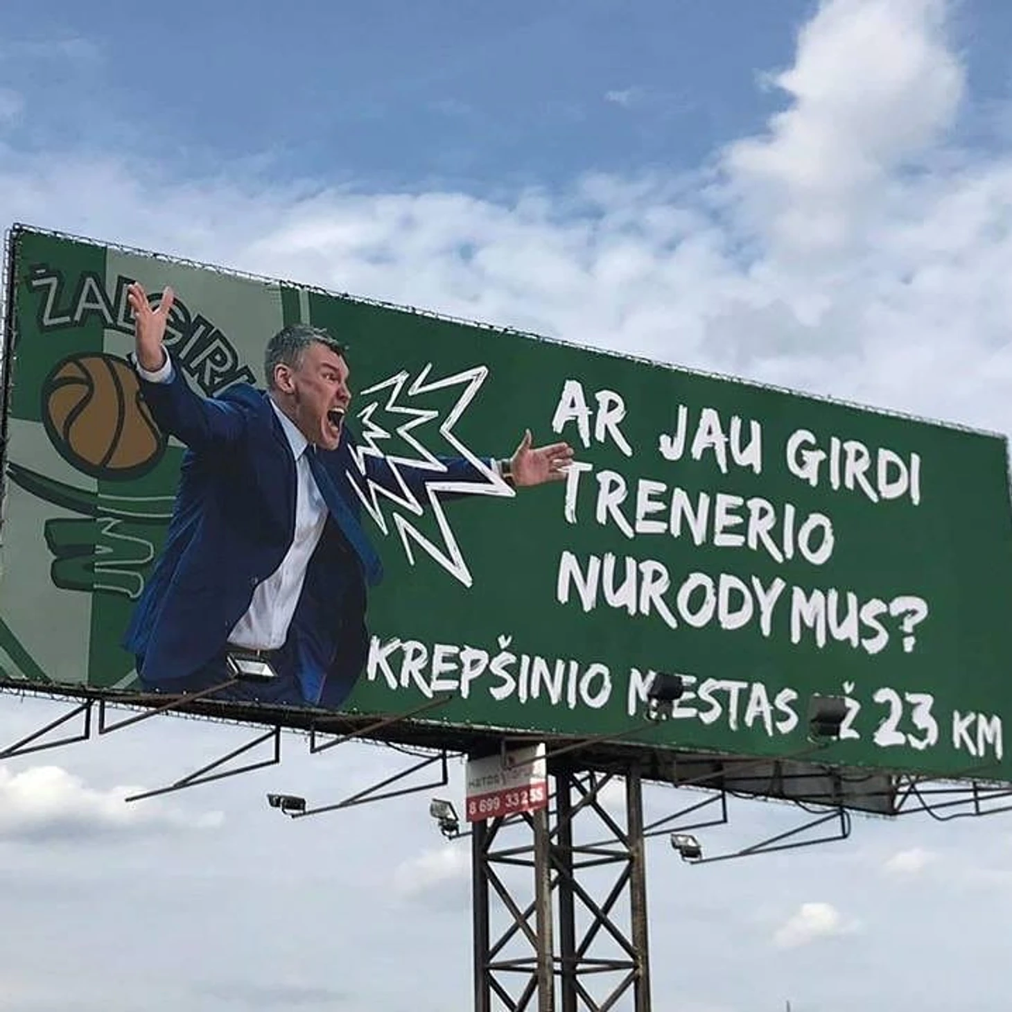 На дороге из Вильнюса в Каунас появился билборд с изображением главного тренера «Жальгириса» Шарунаса Ясикявичюса.