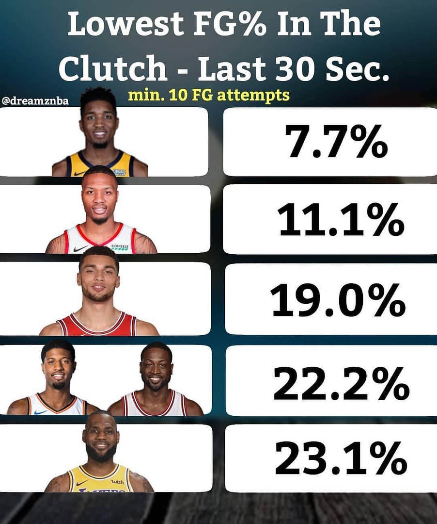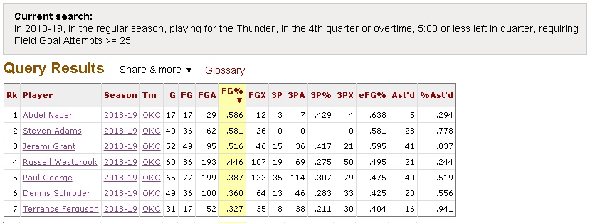 Как видно, Уэстбрук почти ничем не хуже себя самого двухлетней давности. Больше подбирает, больше раздает, меньше теряет. Забивает меньше, но только потому, что отдал львиную долю бросков Джорджу, который теперь вышел на первый план в команде. Бытует мнение, что Уэстбрук плох в концовке игр, а Джордж наоборот очень силен на последних минутах матчей. Но суровая статистика говорит об обратном: