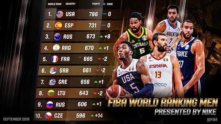 Рейтинг по-прежнему возглавляет команда США, которая в Китае стала 7-й. Чемпион мира Испания сохранила 2-е место, поднявшаяся на 8 позиций Австралия замыкает Топ-3.