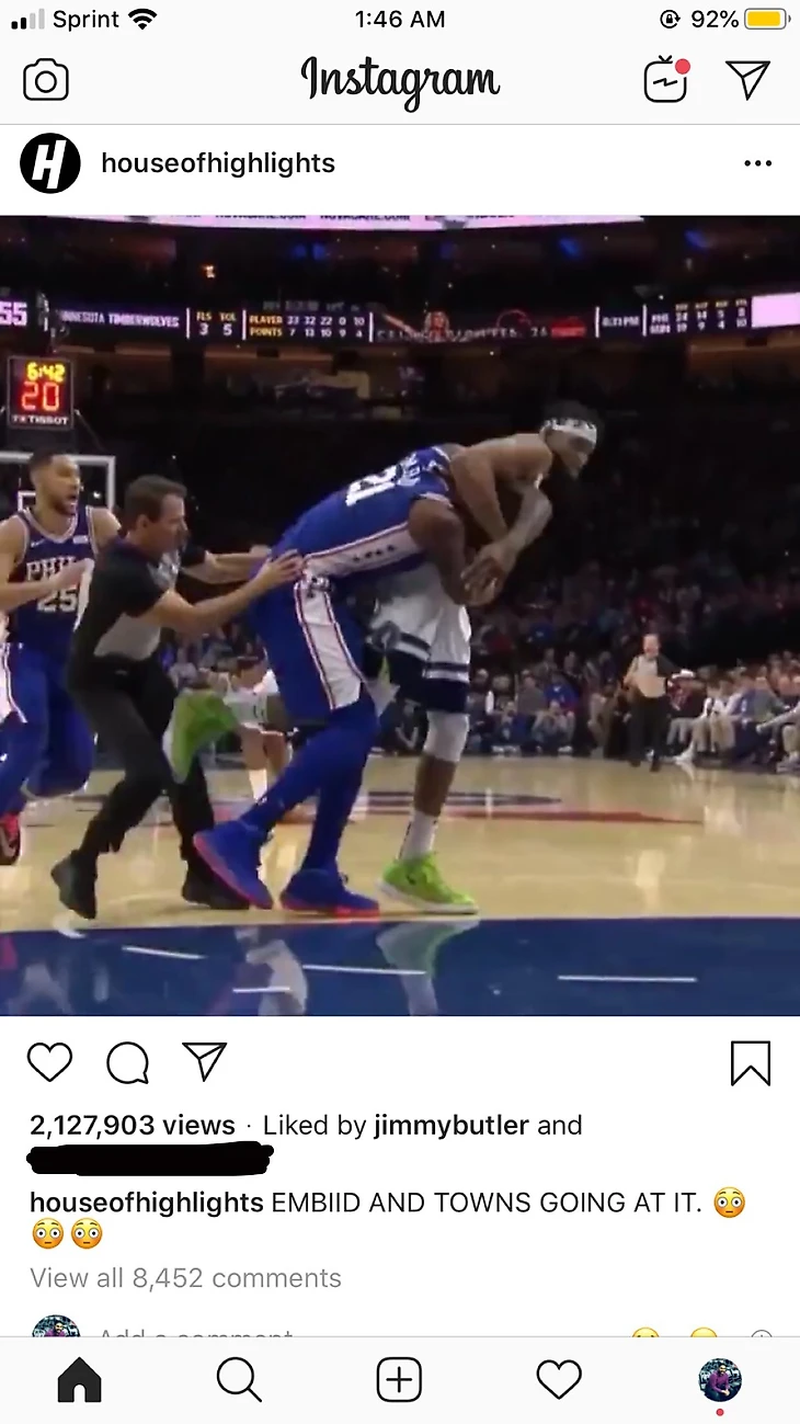 Форвард «Майами» Джимми Батлер лайкнул пост в инстаграме, который посвящен драке его бывших одноклубников Джоэла Эмбиида («Филадельфия») и Карла-Энтони Таунса («Миннесота»).
