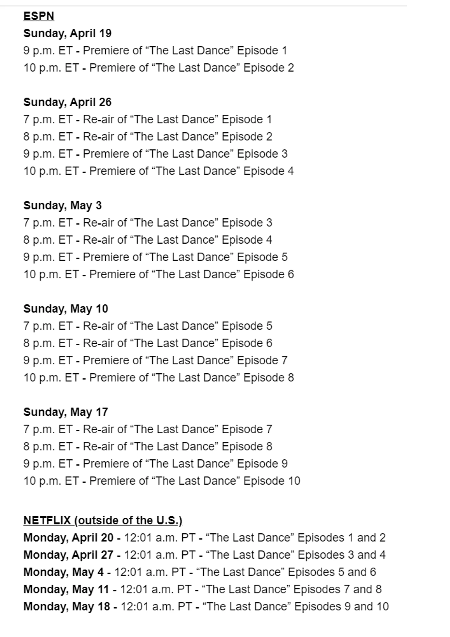 10-серийный фильм был впервые анонсирован в мае 2018 года и изначально запланирован на июнь 2020 года. В связи с приостановкой сезона НБА из-за пандемии коронавируса многие в социальных сетях призывали ESPN назначить премьеру на более раннюю дату, канал пошел навстречу.