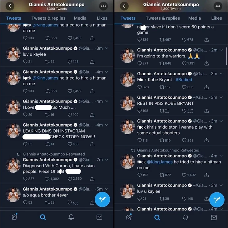 От имени Адетокумбо хакер опубликовал оскорбительные сообщения в адрес «Бакс», Леброна Джеймса, Стефена Карри, Криса Миддлтона и трагически погибшего Кобе Брайанта, а также допустил расистские высказывания в адрес китайцев.