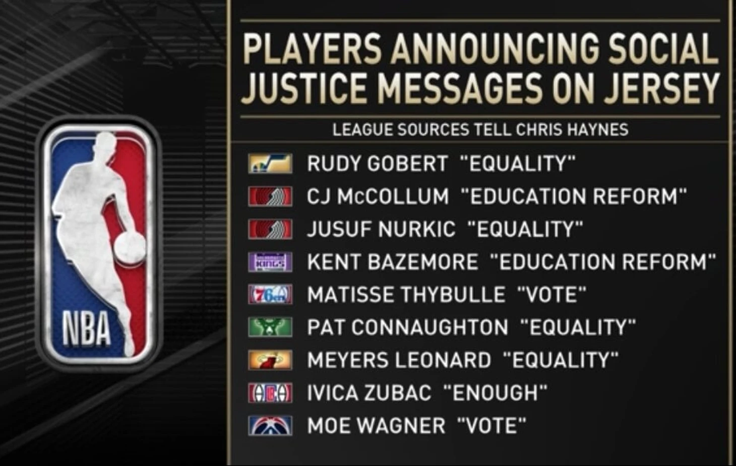 Лига и профсоюз игроков составили список заявлений, которые можно нанести на майки: Black Lives Matter; Say Their Names; Vote; I Can’t Breathe; Justice; Peace; Equality; Freedom; Enough; Power to the People; Justice Now; Say Her Name; Sí Se Puede (Yes We Can); Liberation; See Us; Hear Us; Respect Us; Love Us; Listen; Listen to Us; Stand Up; Ally; Anti-Racist; I Am A Man; Speak Up; How Many More; Group Economics; Education Reform; Mentor.
