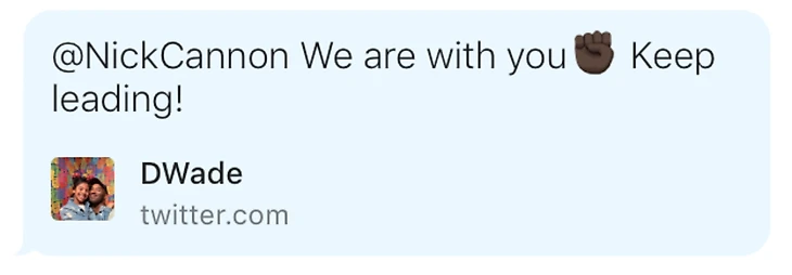 «Хочу пояснить свой удаленный твит. Я не поддерживал и не одобрял то, что конкретно сказал Ник Кэннон, но я выразил ему свою поддержку за его контент и бренд, который он создал», – объяснил Уэйд.