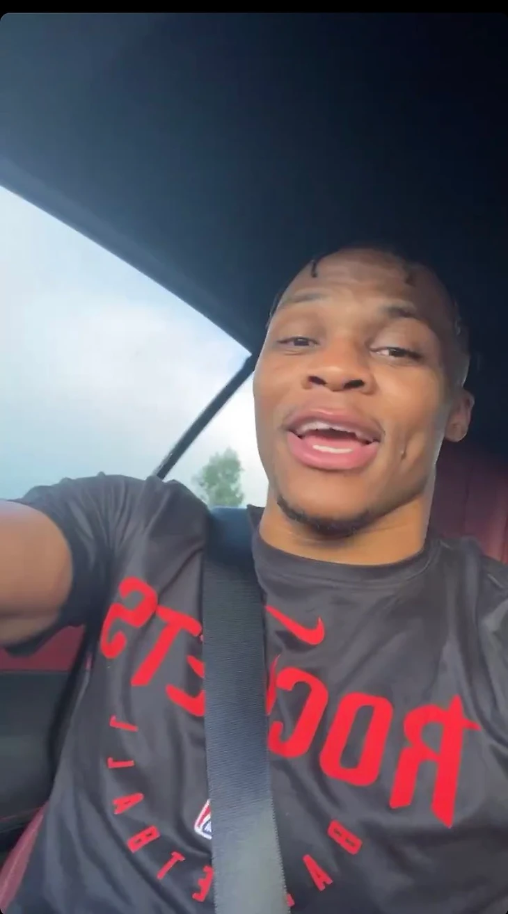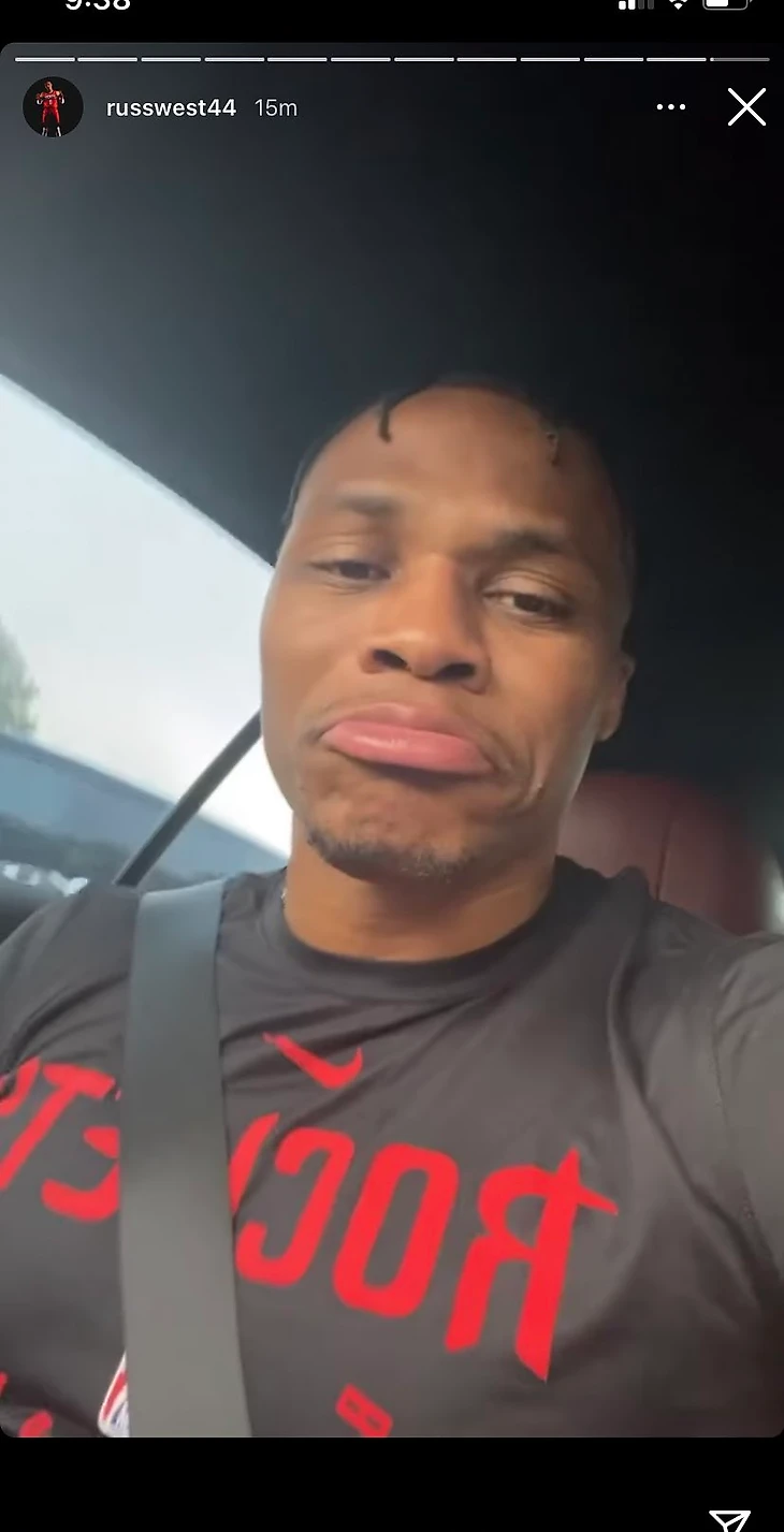 Разыгрывающий «Хьюстона» Расселл Уэстбрук выложил в сторис инстаграма фото, на котором едет за рулем автомобиля в футболке с символикой «Рокетс».