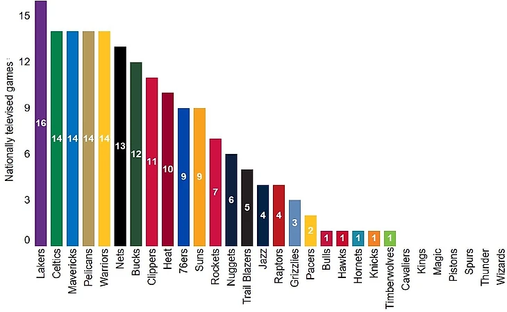 Наибольшее количество матчей, которые будут показаны по национальному телевидению, у действующих чемпионов «Лейкерс» – 16. На два матча меньше получили «Бостон», «Даллас», «Новый Орлеан» и «Голден Стэйт».