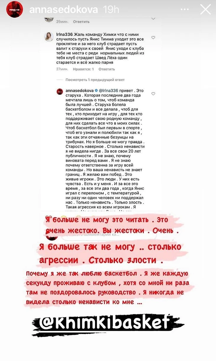 Супруга форварда «Химок» Яниса Тиммы певица Анна Седокова пожаловалась на болельщиков, которые обвиняют ее в неудачной игре баскетболиста и команды.
