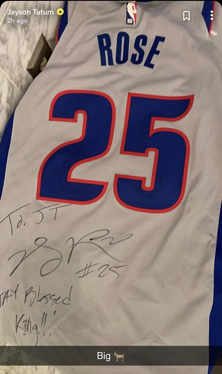 Форвард «Бостона» Джейсон Тейтум после вчерашнего матча с «Детройтом» (122:120) показал в Snapchat майку Деррика Роуза с автографом звездного разыгрывающего «Пистонс».