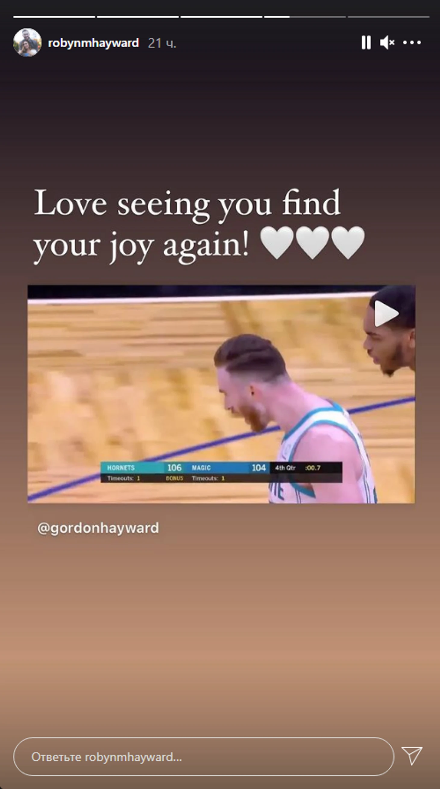 Робин Хэйворд, супруга игрока «Хорнетс» Гордона Хэйворда написала, что в клубе из Шарлотт форвард снова стал получать удовольствие от баскетбола.