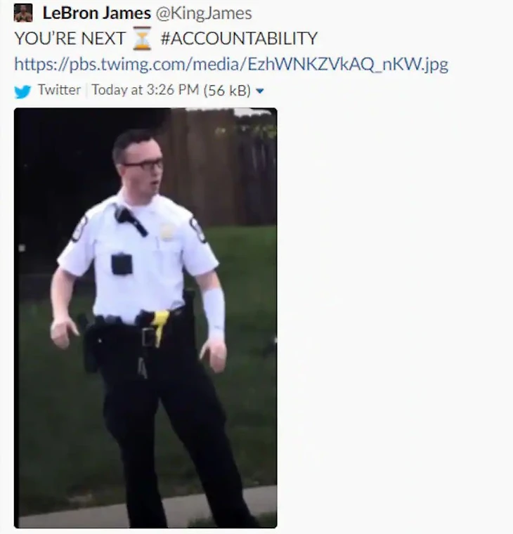 Девушка была застрелена белым полицейским Николасом Рирдоном. Джеймс опубликовал фотографию офицера с подписью «Ты следующий», но позже удалил твит.