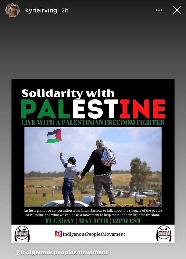 Второй пост Ирвинга по конфликту на Ближнем Востоке: «Солидарность с Палестиной – прямой эфир с палестинским борцом за свободу». Сообщение отсылает к эфиру в инстаграме Линды Сарсур, американской политической активистки, которая выражает антисемитские и антиизраильские взгляды. Она рассказала о том, как люди могут помочь палестинскому движению в борьбе за свободу.