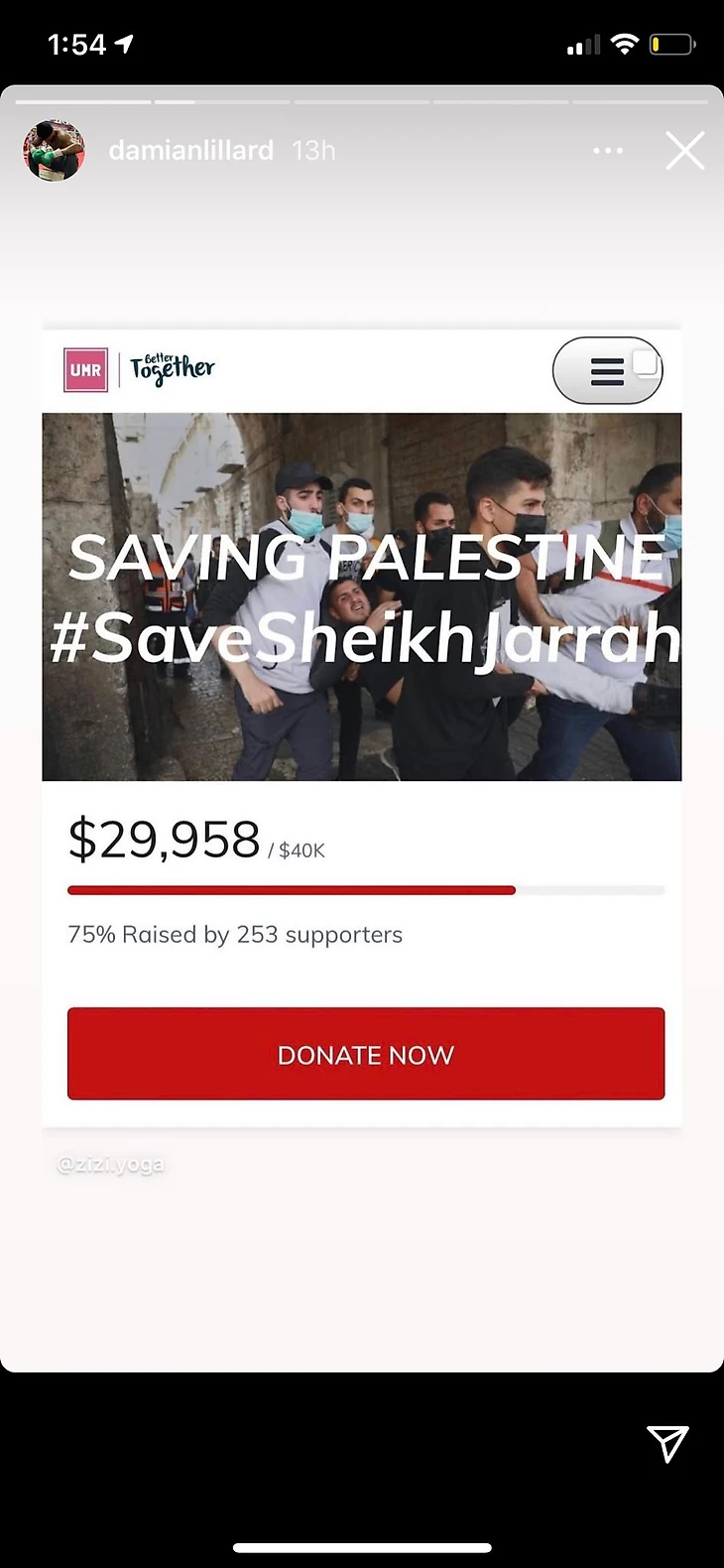 Лиллард выложил в инстаграме пост «Спасение Палестины», который отсылает к сбору средств для пострадавших в конфликте палестинцев.