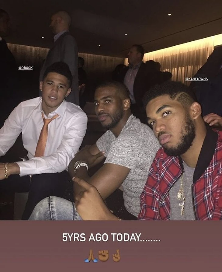 Разыгрывающий «Финикса» Крис Пол опубликовал в соцсети старую фотографию, на которой изображены он, его партнер по команде Девин Букер и центровой «Миннесоты» Карл-Энтони Таунс.