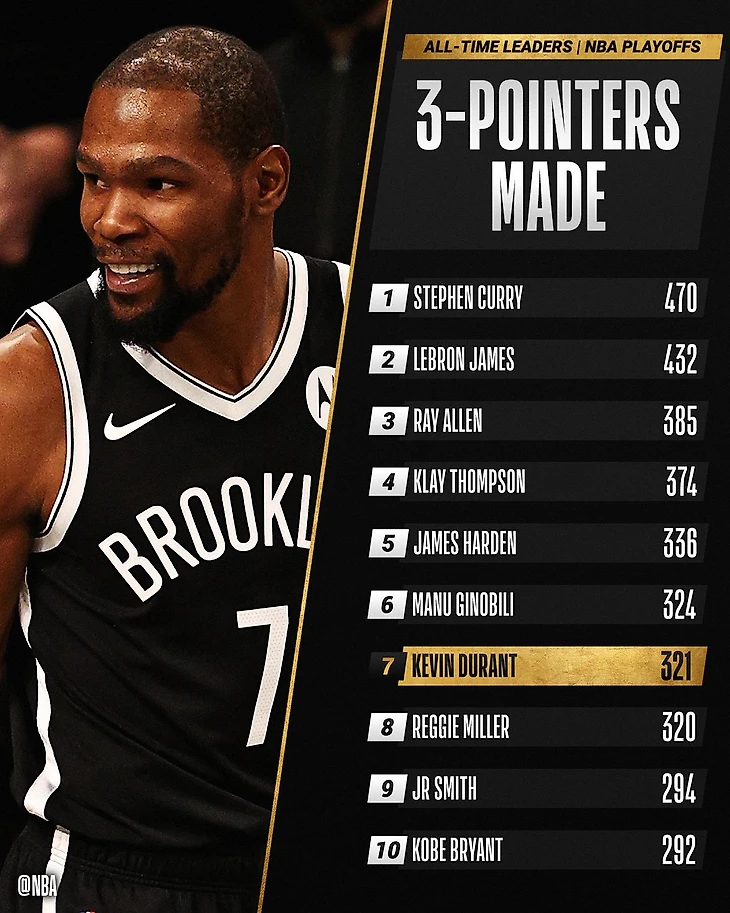 Форвард «Нетс» Кевин Дюрэнт в понедельник вышел на общее 7-е место по реализованным 3-очковым в истории плей-офф НБА.