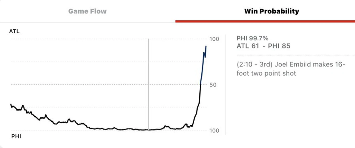 Компьютерная система, которая оценивает шансы на победу команд по ходу матчей, отдавала «Сиксерс» 99,7% на успех под занавес третьей четверти пятой встречи с «Хоукс».
