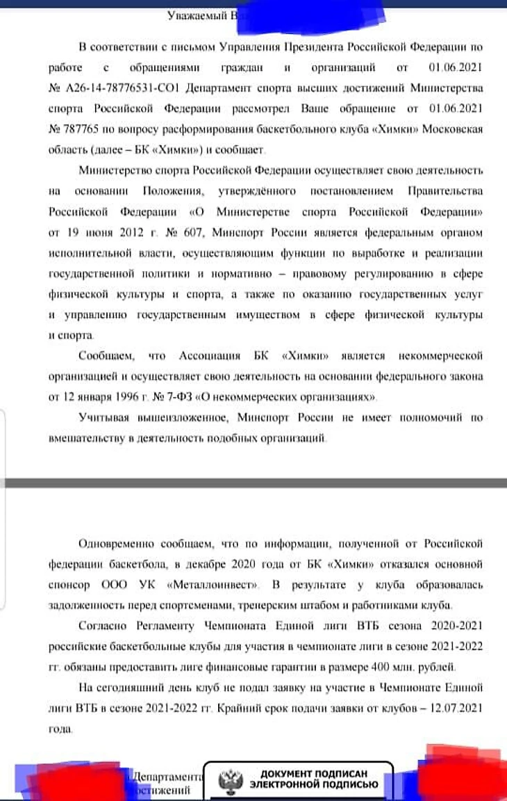 Согласно тексту письма, основной спонсор ООО УК «Металлоинвест» отказался от финансирования подмосковного клуба в декабре 2020 года. При этом «Химки» пока не подавали заявку на участие в сезоне Единой лиги ВТБ-21/22, но могут это сделать до 12 июля – в случае предоставления финансовых гарантий в размере 400 миллионов рублей.