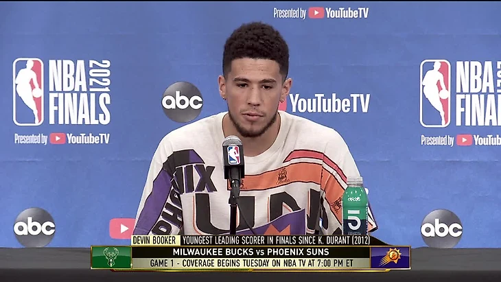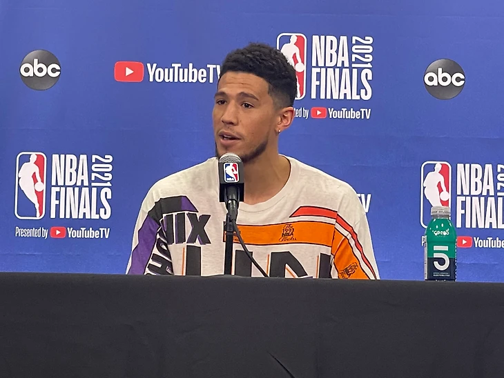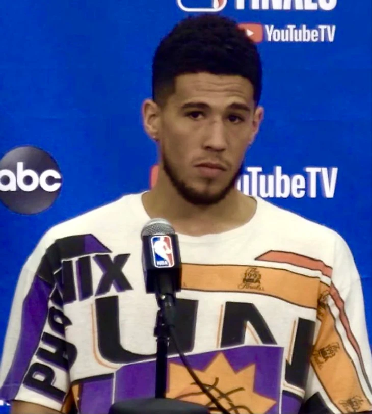 Звездный защитник «Финикса» Девин Букер пришел сегодня на пресс-конференцию, посвященную старту финальной серии против «Милуоки», в клубной футболке дизайна 1993 года.
