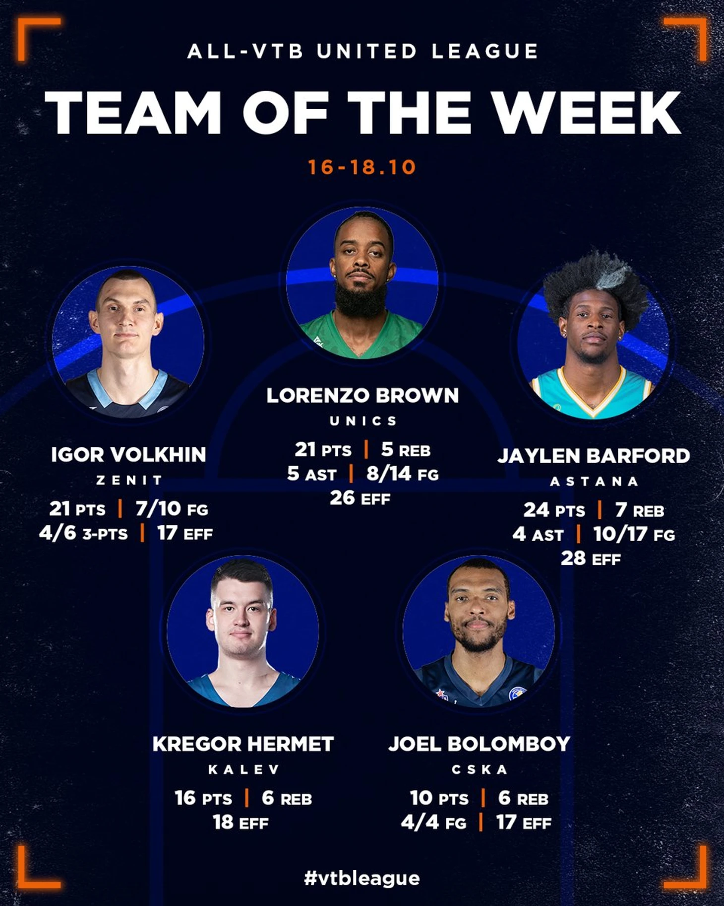 В пятерку лучших игроков вошли Лоренцо Браун (УНИКС), Джейлен Барфорд («Астана»), Игорь Вольхин («Зенит»), Крегор Хермет («Калев») и Джоэл Боломбой (ЦСКА).
