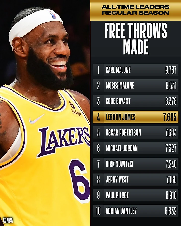 Форвард «Лейкерс» Леброн Джеймс в воскресенье поднялся на 4-е место в истории НБА по реализованным штрафным за карьеру.