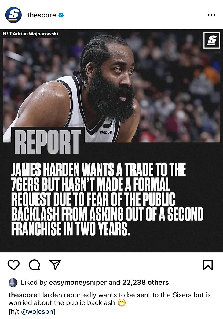 Согласно сообщению инсайдера ESPN Эдриана Воджнаровски, Харден хочет, чтобы его обменяли в «Филадельфию», но не стал подавать официальную просьбу, опасаясь негативной реакции общественности.