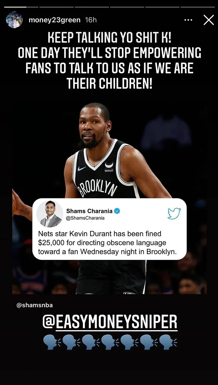 Форвард «Голден Стэйт» Дрэймонд Грин поддержал игрока «Бруклина» Кевина Дюрэнта, который получил штраф за мат в адрес болельщика.