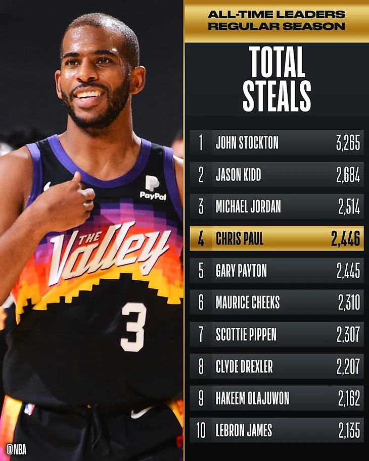 Разыгрывающий «Финикса» Крис Пол в пятницу вышел на 4-е место в истории НБА по перехватам за карьеру.