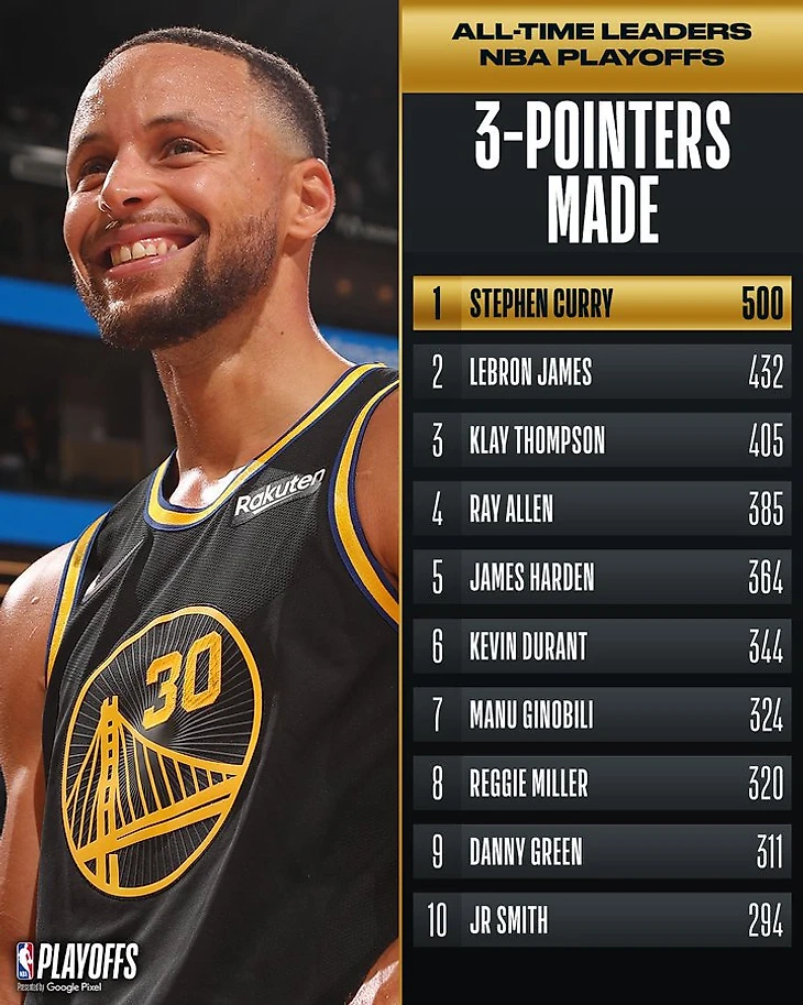 Стеф Карри стал 1-м в истории плей-офф НБА, кто реализовал 500 3-очковых