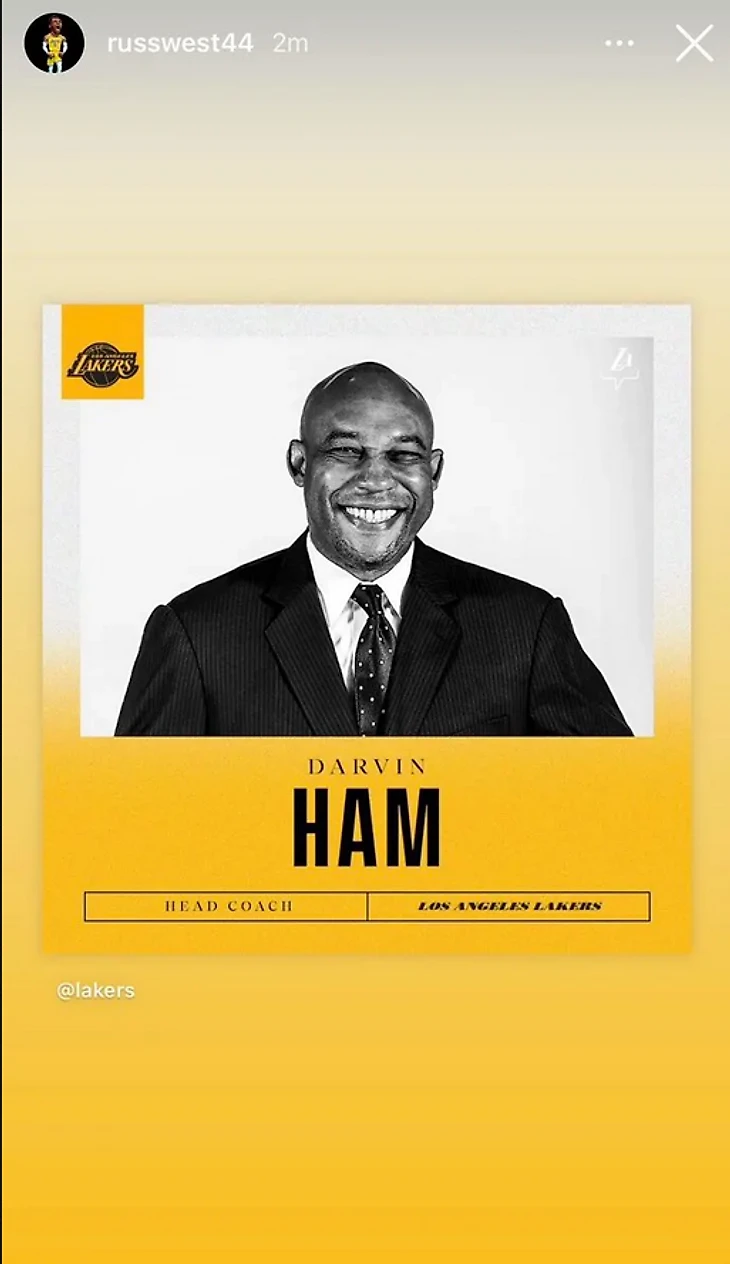 Звездный разыгрывающий «Лейкерс» Расселл Уэстбрук отреагировал на назначение Дарвина Хэма на должность главного тренера команды.