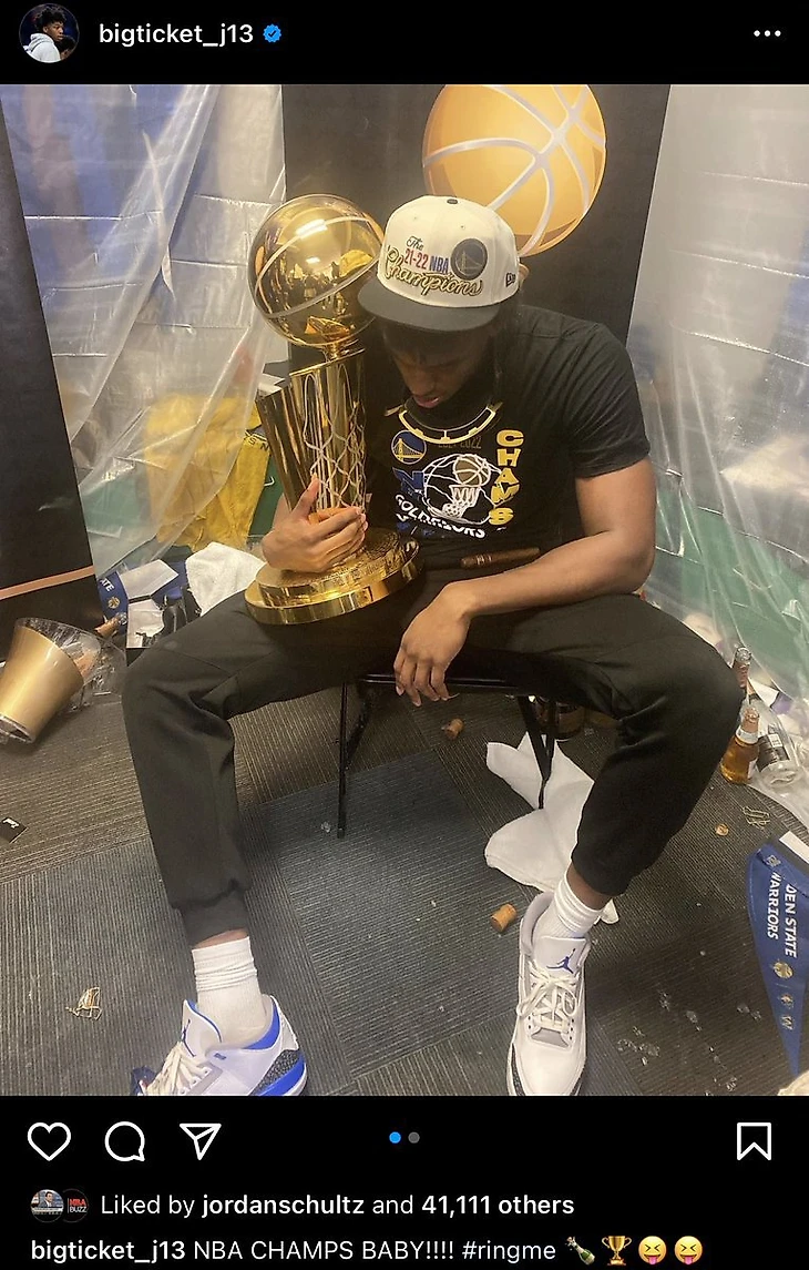 Центровой «Голден Стэйт» Джеймс Уайзмен сфотографировался с кубком Ларри О’Брайена, сидя на стуле, изобразив знаменитый снимок Кобе Брайанта 2001 года.