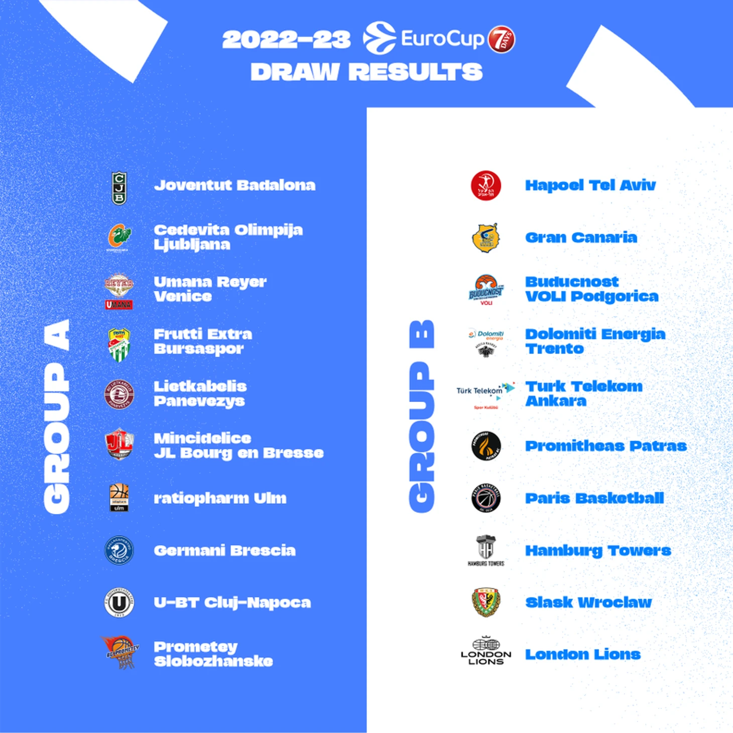Группа В: Хапоэль Тель-Авив (Израиль), Лондон Лайонс (Англия), Париж (Франция), Будучность (Черногория), Гран-Канария (Испания), Гамбург (Германия), Тренто (Италия), Шленск (Польша), Тюрк Телеком (Турция), Промитеас (Греция).