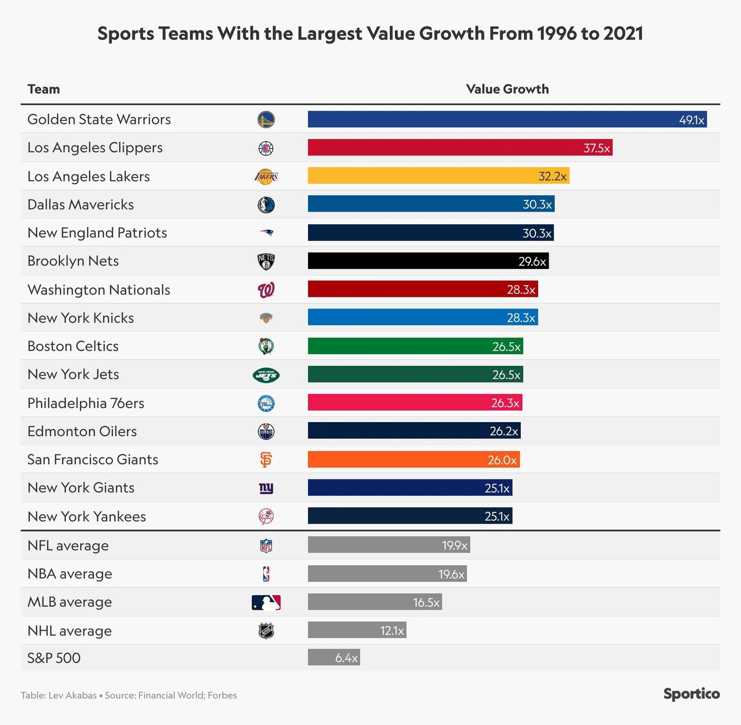 За период с 1996 по 2021 год «Уорриорз» подорожали в 49,1 раза. На втором месте по данному показателю находятся «Клипперс» (37,5x), на третьем – «Лейкерс» (32,2x).