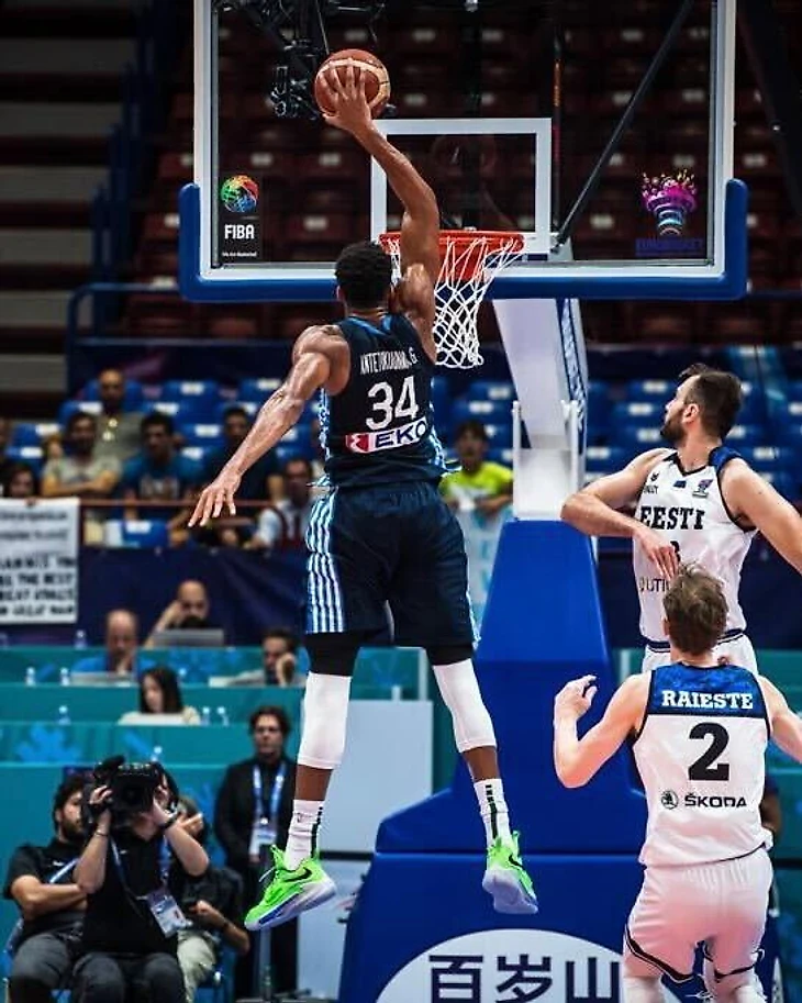 Форвард сборной Греции Яннис Адетокумбо выложил в твиттере фотографию собственного данка в последнем матче группового этапа Евробаскета с Эстонией.
