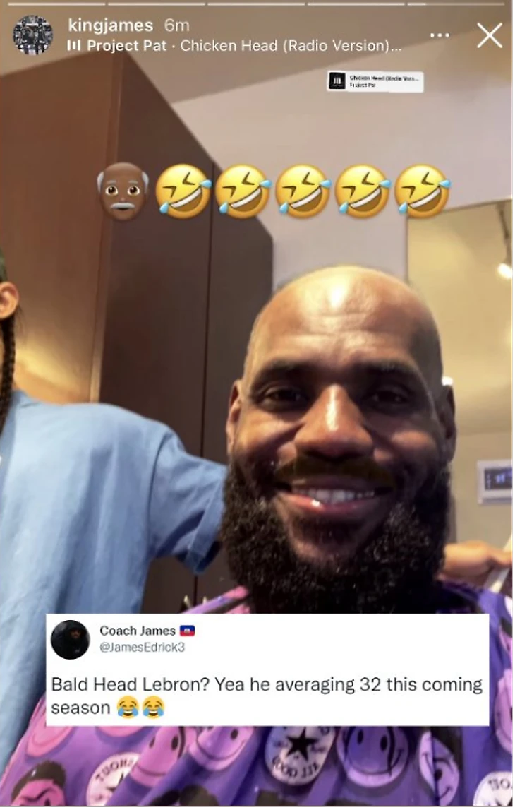 Звездный форвард «Лейкерс» Леброн Джеймс опубликовал в сторис Instagram свою фотографию с бритой налысо головой.