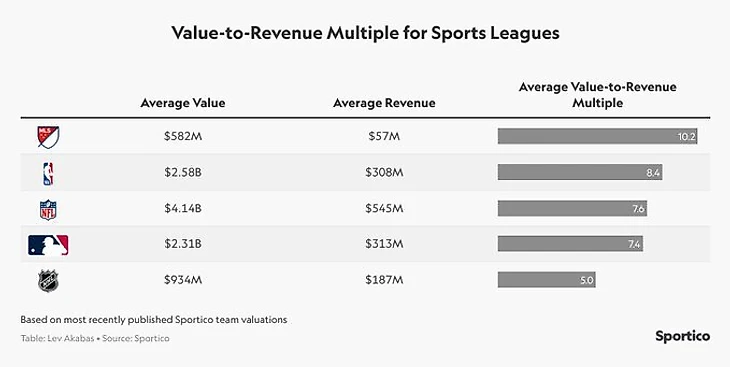 Среднее значение соотношения цены и дохода НФЛ составляет 7,6, а средняя стоимость клуба — 4,1 миллиарда. Показатель MLB — 7,4, НХЛ — 5,0.